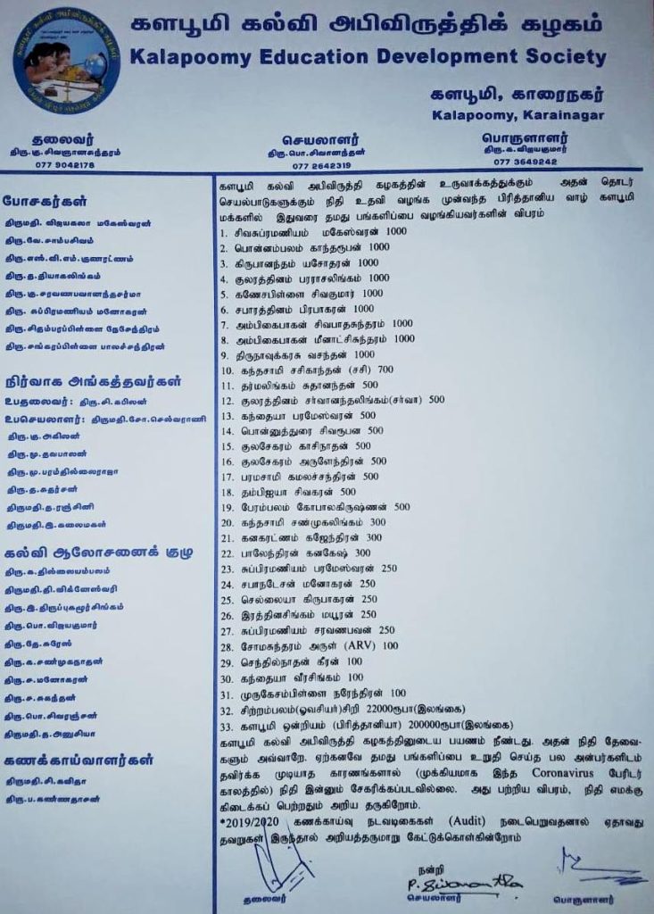 களபூமி கல்வி அபிவிருத்தி கழகம் கடந்த டிசம்பர் மாதம் வெளியிட்டுள்ள ஓர் அறிவித்தலும் இத்துடன் இணைக்கப்பட்டுள்ளது. அத்துடன் 2019.11.10 அன்று நடைபெற்ற பொதுக்கூட்டத்தின் புகைப்படங்களும் ஏற்கெனவே இந்த இணையத்தளத்தில் வெளியிடப்பட்டிருந்தாலும் மீண்டும் எடுத்து வரப்பட்டுள்ளன.