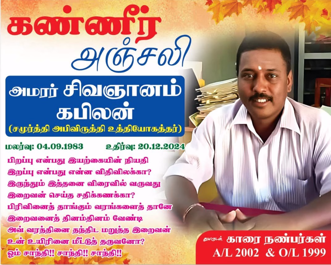 கபிலன் என்ற காந்த குரலோன், நண்பர்களிற்கெல்லாம் நண்பன், காரை மண்ணின் சிரிப்பு அழகன், களபூமி மண்ணின் செல்லப்பிள்ளை, அறிவிப்புக்களிற்கெல்லாம் அறிவாக திகழ்பவன் அவசரமாய் சென்றுவிட்டான்.
