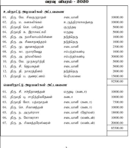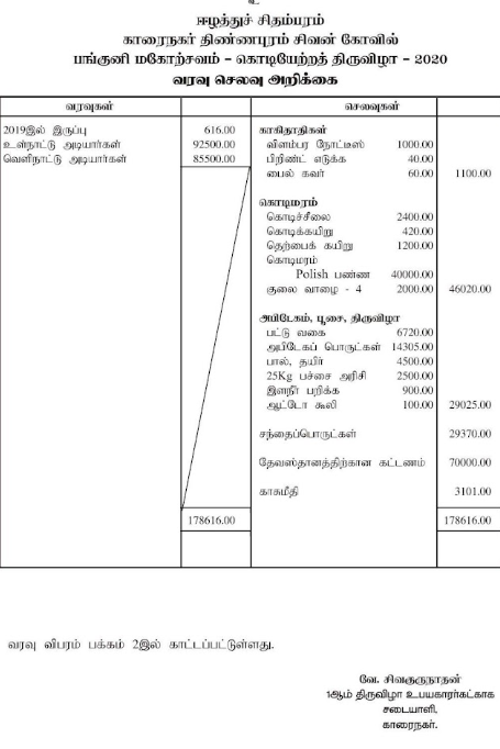 2019, 2020 ம் ஆண்டுக்கான முதலாம் திருவிழாவிற்கான வரவு செலவு அறிக்கை திரு. வே.முருகமூர்த்தி அவர்களின் துணையுடன் தற்போது வெளியிடப்பட்டுள்ளது. அதனையும் பார்வையிட்டு எதிர்வரும் 19.03.2021 அன்று நடைபெறவுள்ள பங்குனி மகோற்சவ கொடியேற்ற திருவிழாவிற்கான தங்களது பங்களிப்பினை நேரடியாகவோ அன்றி என்னை தொடர்பு கொண்டோ வழங்கி உங்கள் பெயரிலேயே ரசீதினையும் பெற்றுக்கொள்ள முடியும்.