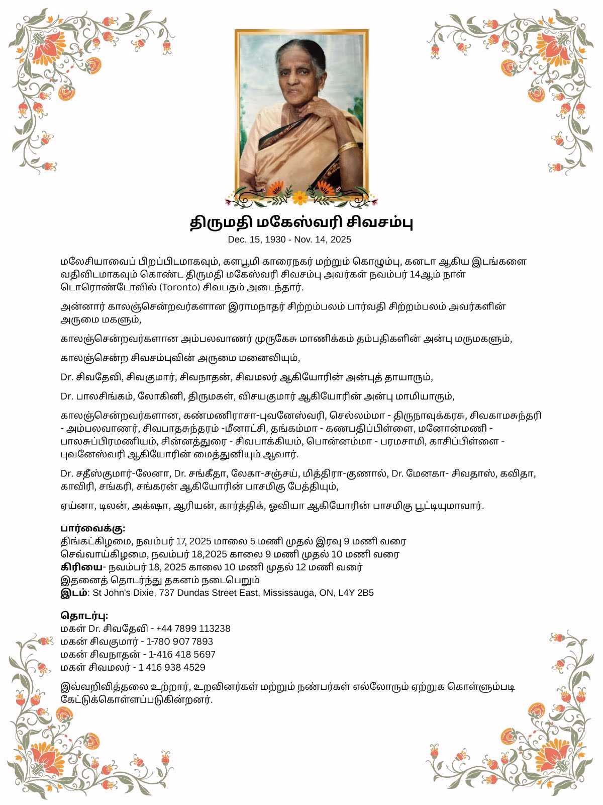 கனடா காரை கலாசார மன்றத்தின் கடந்த நிர்வாக சபையின் தலைவர் திரு.சிவநாதன் சிவசம்பு அவர்களின் தாயார் திருமதி மகேஸ்வரி சிவசம்பு அவர்கள் 95வது வயதில் கனடா ரொறன்ரோவில் இயற்கையெய்தினார். அன்னாரது பிரிவால் துயருறும் குடும்பத்தினருக்கு கனடா காரை கலாசார மன்றத்தின் முன்னாள் நிர்வாக சபை உறுப்பினர்கள் மற்றும் கனடா வாழ் காரை மக்களின் சார்பாக ஆழ்ந்த இரங்கலையும் அஞ்சலியினையும் தெரிவித்துக்கொள்கிறது ‘ எனது ஊர் காரைநகர்’ karainews.com.