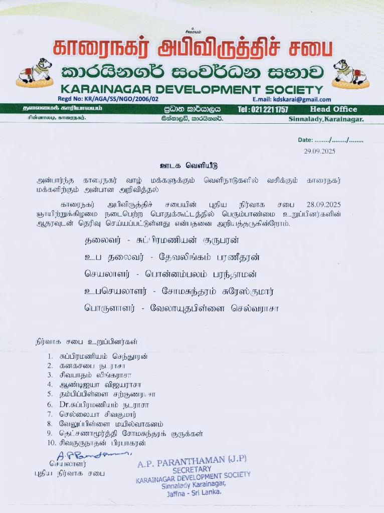 காரைநகர் அபிவிருத்தி சபை புதிய நிர்வாக சபையின் திரு. குருபரன் சுப்பிரமணியம் தலைமையிலான நிர்வாக சபையின் முதலாவது நிர்வாக சபை கூட்டம் 26.10.2025 இன்று ஞாயிற்றுக்கிழமை தங்கோடை கிராம அபிவிருத்தி சங்க மண்டபத்தில் நடைபெற்றுள்ளது. 15நர்வாக சபை உறுப்பினர்களைக்கொண்டுள்ள நிர்வாகத்தில் இருந்து 12 அங்கத்தவர்கள் கலந்து கொண்டு பலவிதமான தீர்மானங்களை நிறைவேற்றியும் பல தேவைகளிற்கான உபகுழுக்கள் அமைக்கப்பட்டும் ஆக்கபூர்வமான முறையில் நிர்வாக சபைக்கூட்டம் நடைபெற்றுள்ளதாக அறியப்படுகிறது.