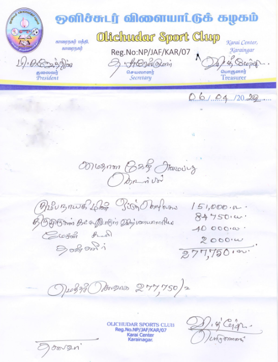 நேரடியாக ஒளிச்சுடர் விளையாட்டு கழகம் ஊடாக தங்களது பெயரில் ரசீதி உடனடியாக பெற்று வழங்கப்படும். ‘எனது ஊர் காரைநகர்” இணையத்தளம் ஊடாக இந்த திட்டம் அறியத்தரப்பட்டாலும் நீங்கள் வழங்கும் நிதியுதவி நேரடியாக தங்கள் பெயரிலேயே விளையாட்டு கழகத்திடம் சமர்ப்பிக்கப்படும். கேற் அமைப்பதற்காக வேலைகள் ஏற்கெனவே ஆரம்பிக்கப்பட்டுள்ள நிலையிலும் நாட்டின் சூழ்நிலைகளினால் பொருட்கள் மற்றும் கூலியின் தொகை அதிகரித்து வருவதாலும் 25.05.2022 அடுத்த வாரம் உத்தேசிக்கப்பட்ட தொகை அனுப்பப்படவுள்ளது.