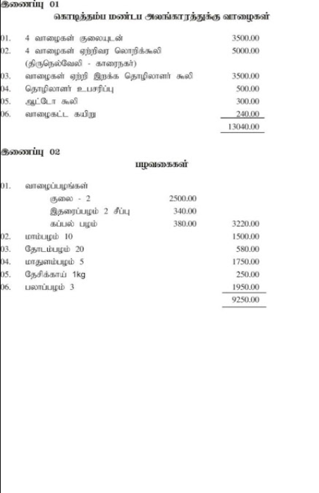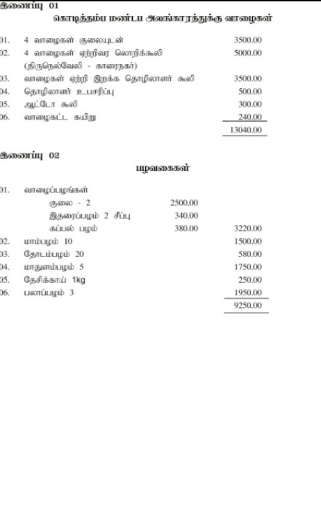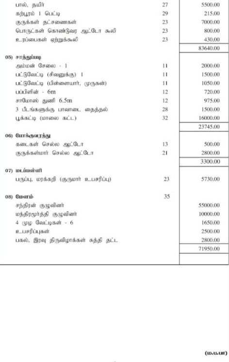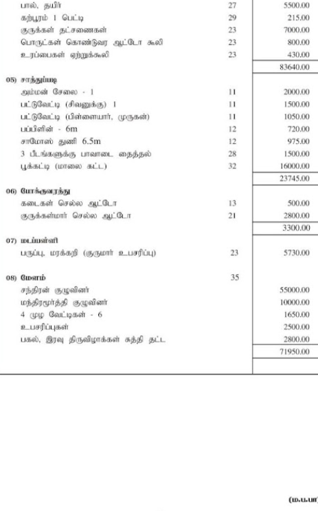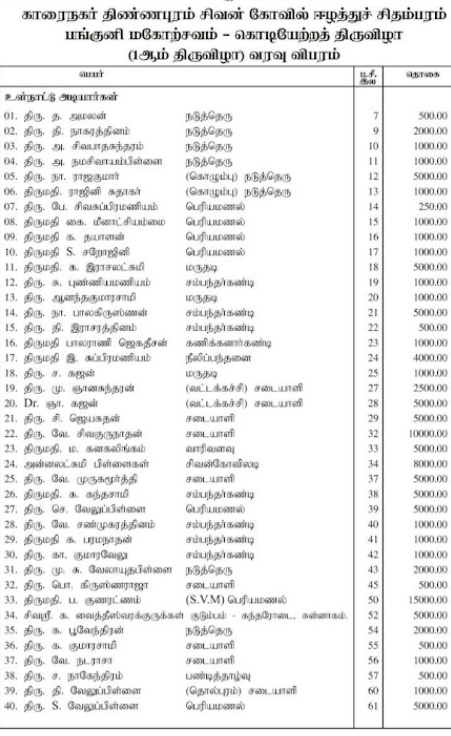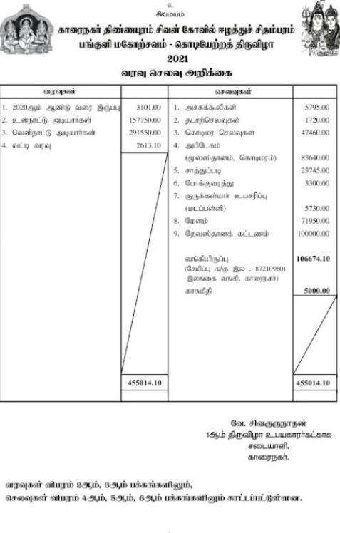 2021 வரவு செலவு விபரம் இணைக்கப்பட்டுள்ளது. இந்த விபரத்தில் கோயில் நிர்வாகத்திடம் நேரடியாக முதலாம் நாள் திருவிழாவிற்காகவென குறிப்பிட்டு நிதியுதவி அளித்தவர்கள் மற்றும் திருவிழா செயற்பாட்டாளர்களிடம் நிதியுதவி வழங்கியவர்கள் அனைவரது பெயர் விபரங்களும் சேர்ந்து இணைக்கப்பட்டுள்ளன கவனிக்கத்தக்கது.