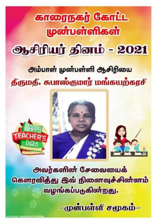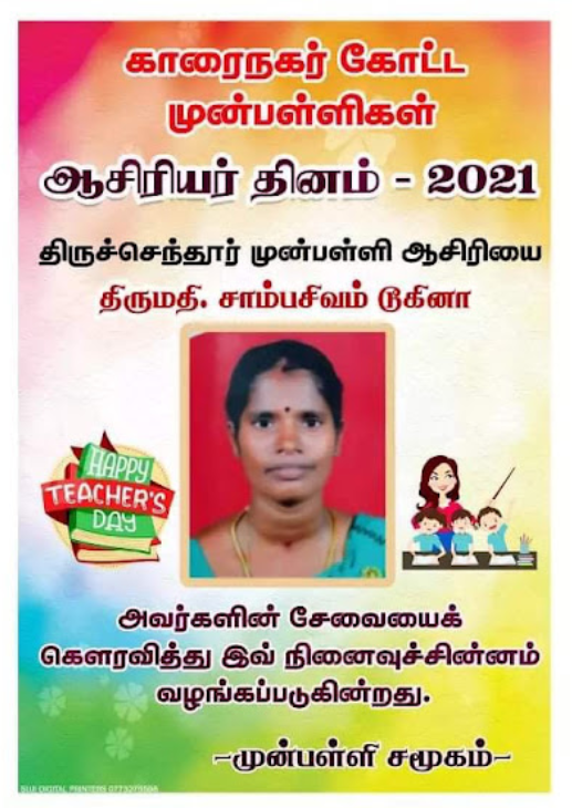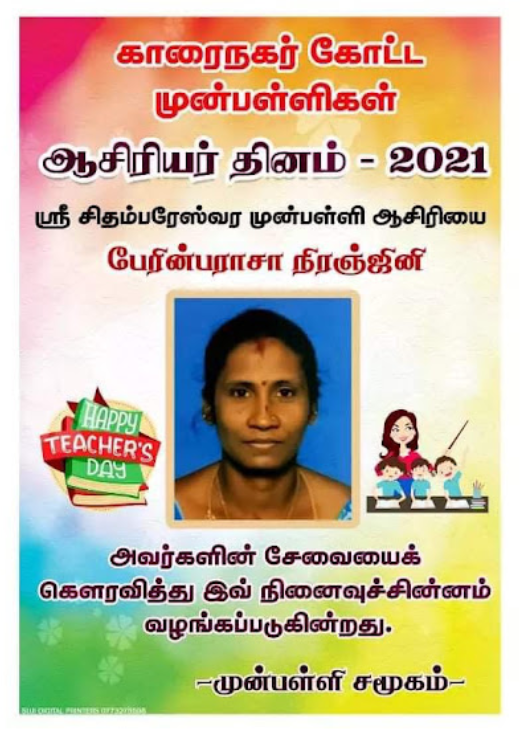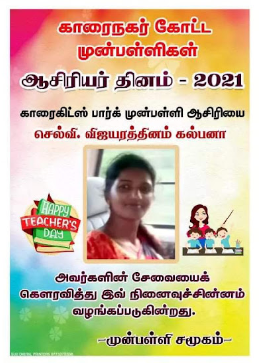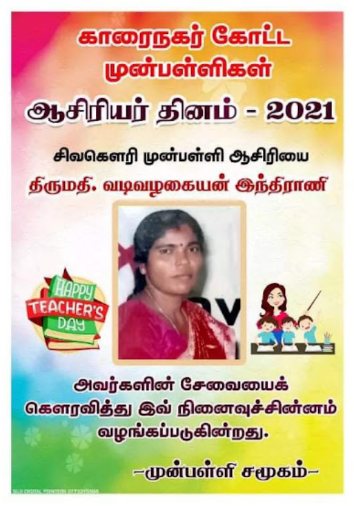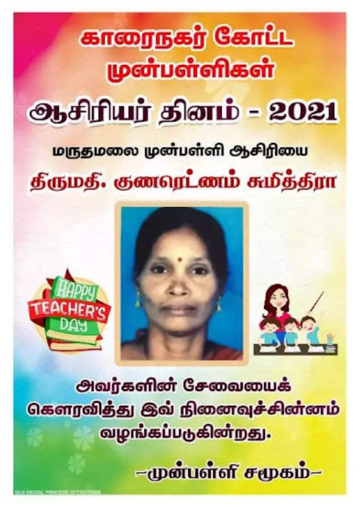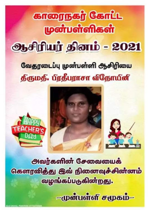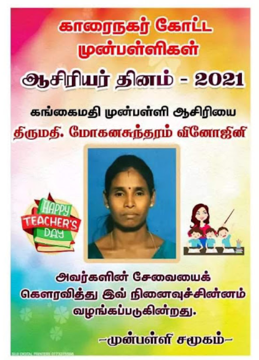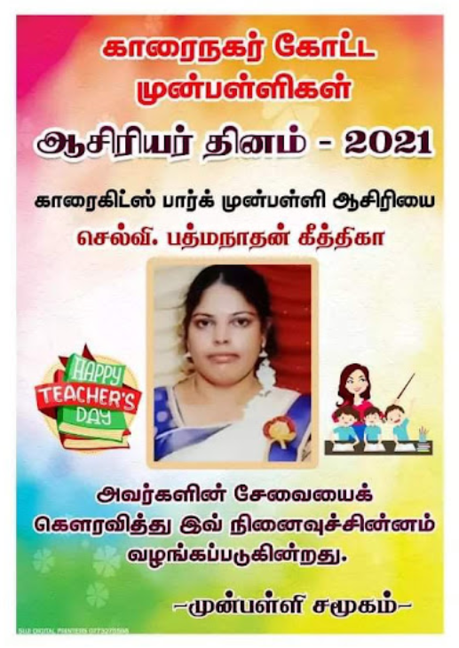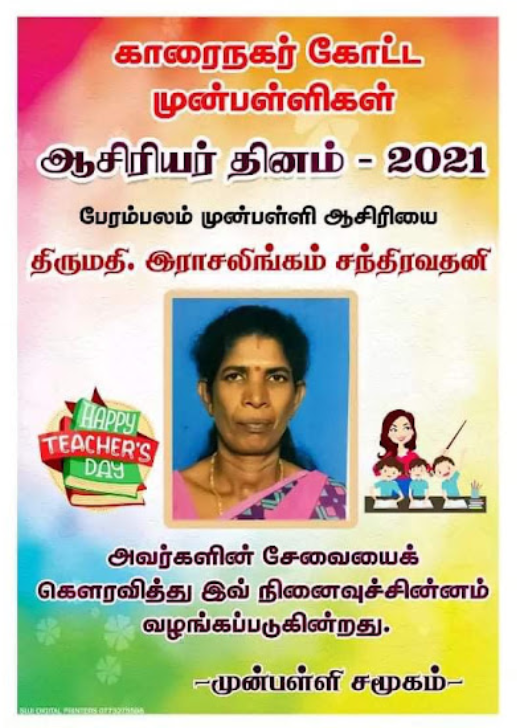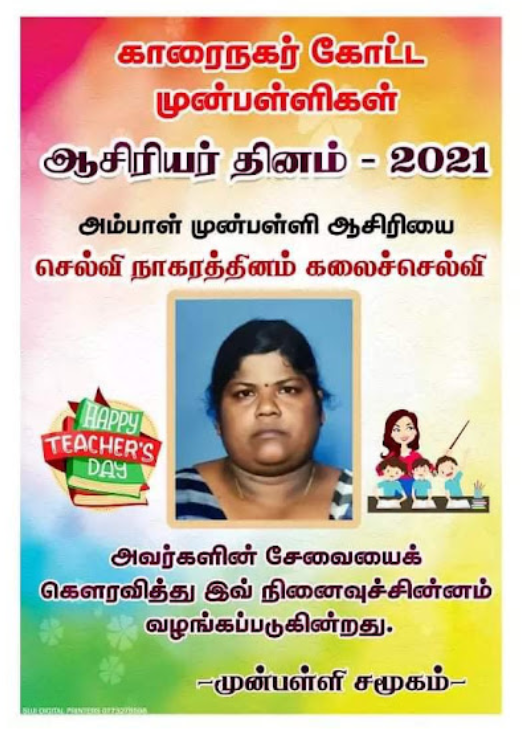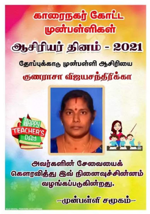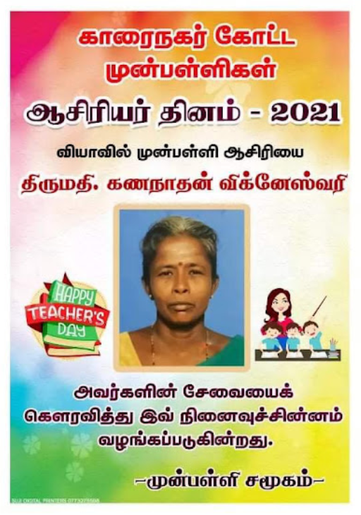 காரைநகர் முன்பள்ளிகள் ஆசிரியர்கள் விபரங்களை தெரிந்து கொள்வோம். 22.10.2021 அன்று நடைபெற்ற ஆசிரியர் தின விழாவின் போது கௌரவிக்கப்பட்ட முன்பள்ளி ஆசிரியர்கள் விபரம்